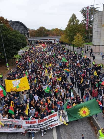 Bir çok ülkede ve Almanya’nın bazı kentlerinde olduğu gibi Hamburg’da da savaşı protesto amacıyla çoğunluğunu Almanların ve Kürtlerin oluşturduğu güçlü bir protesto eylemi yapıldı.